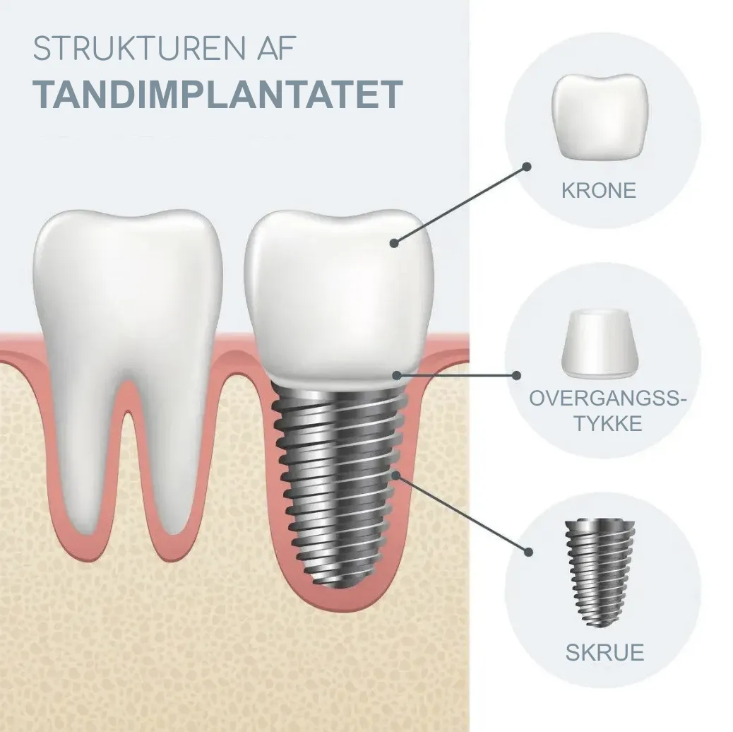 Tandimplantater består typisk af tre dele – selve implantatet, abutmentet og kronen. Implantatet er lavet af medicinsk titanium.