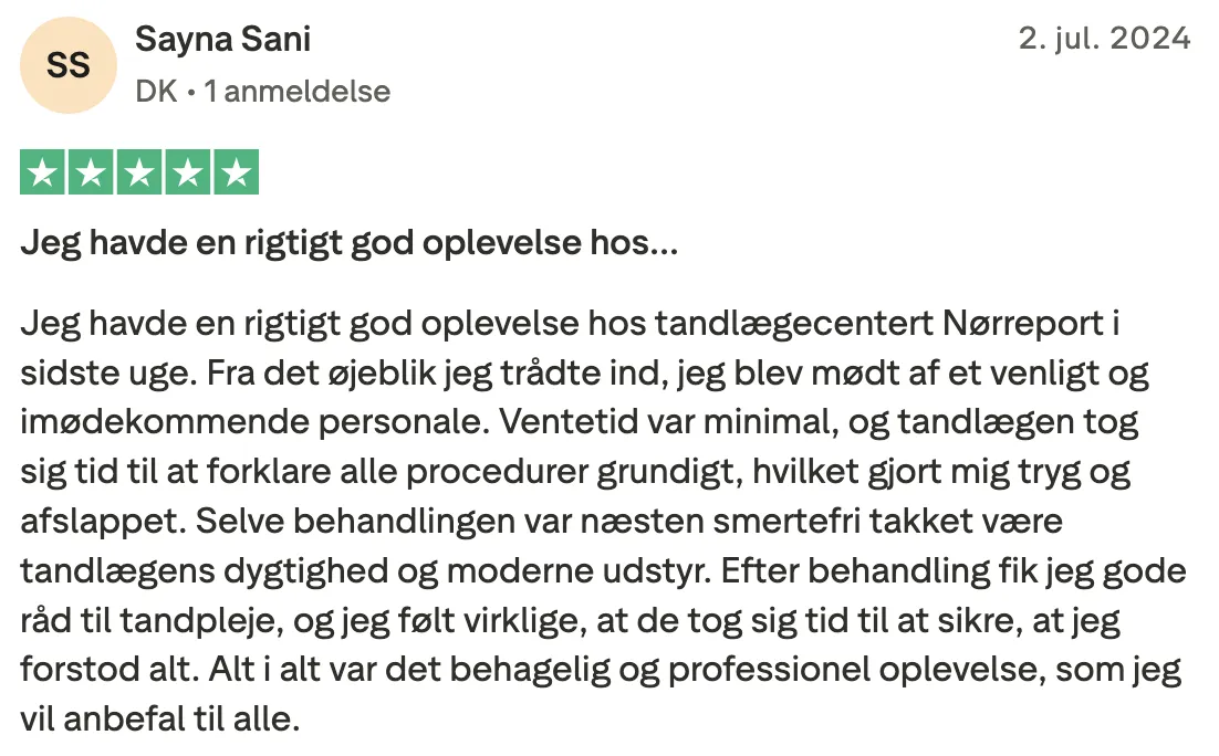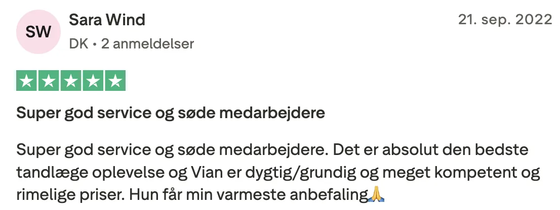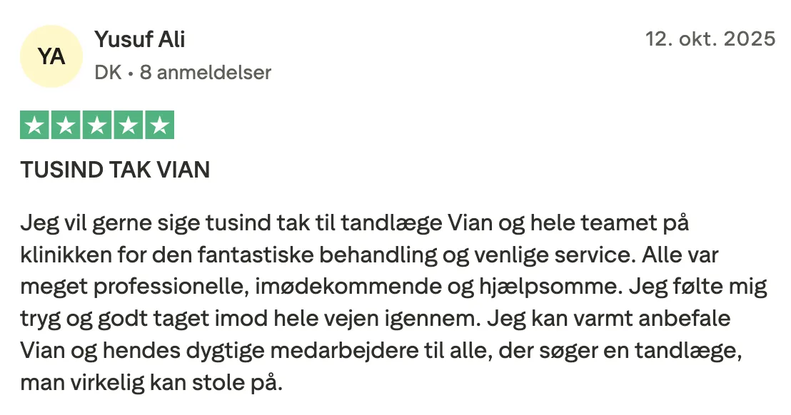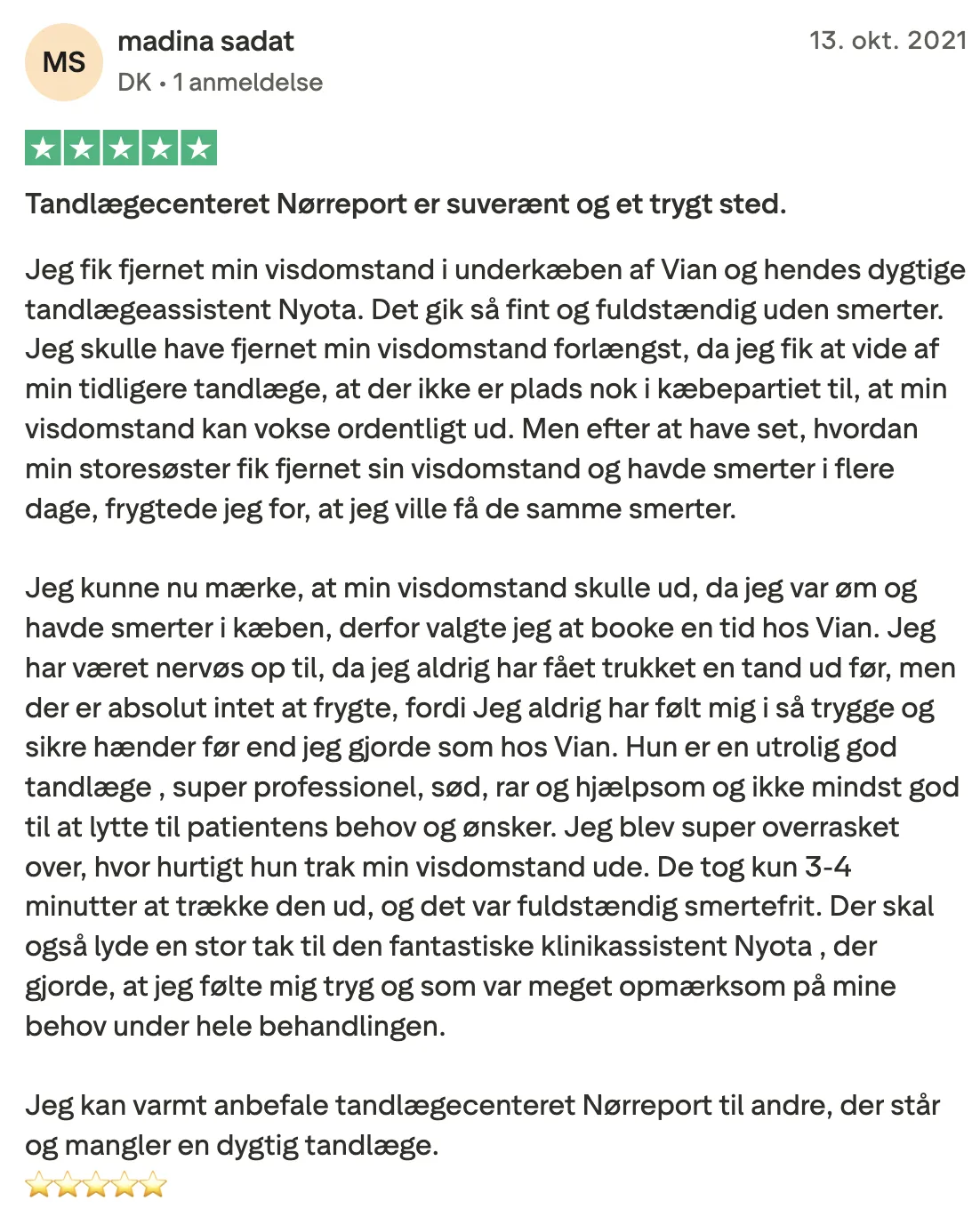Jeg har tandlægeskræk, så jeg er meget glad for at være klient hos Vian, hun er super professionel, nærværende sød og smilende og det er det øvrige personale også. Jeg kunne nu mærke, at min visdomstand skulle ud, da jeg var øm og havde smerter i kæben, derfor valgte jeg at booke en tid hos Vian. Jeg har været nervøs op til, da jeg aldrig har fået trukket en tand ud før, men der er absolut intet at frygte, fordi Jeg aldrig har følt mig i så trygge og sikre hænder før end jeg gjorde som hos Vian. Hun er en utrolig god tandlæge , super professionel, sød, rar og hjælpsom og ikke mindst god til at lytte til patientens behov og ønsker. Jeg blev super overrasket over, hvor hurtigt hun trak min visdomstand ude. De tog kun 3-4 minutter at trække den ud, og det var fuldstændig smertefrit. Der skal også lyde en stor tak til den fantastiske klinikassistent Nyota , der gjorde, at jeg følte mig tryg og som var meget opmærksom på mine behov under hele behandlingen. Jeg kan varmt anbefale tandlægecenteret Nørreport til andre, der står og mangler en dygtig tandlæge.