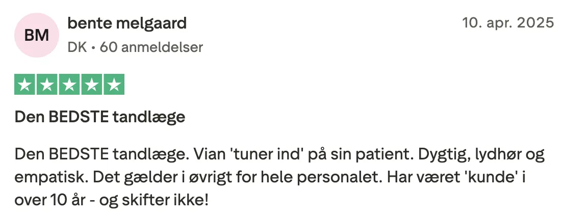 Jeg har været patient på Tandlægecentret Nørrebro siden Vian åbnede klinikken og er er så glad og tilfreds med behandlingen, at jeg med glæde vil anbefale Tandlægecentret til alle der ønsker en god tandlæge. Mvh. Michael Schmidt